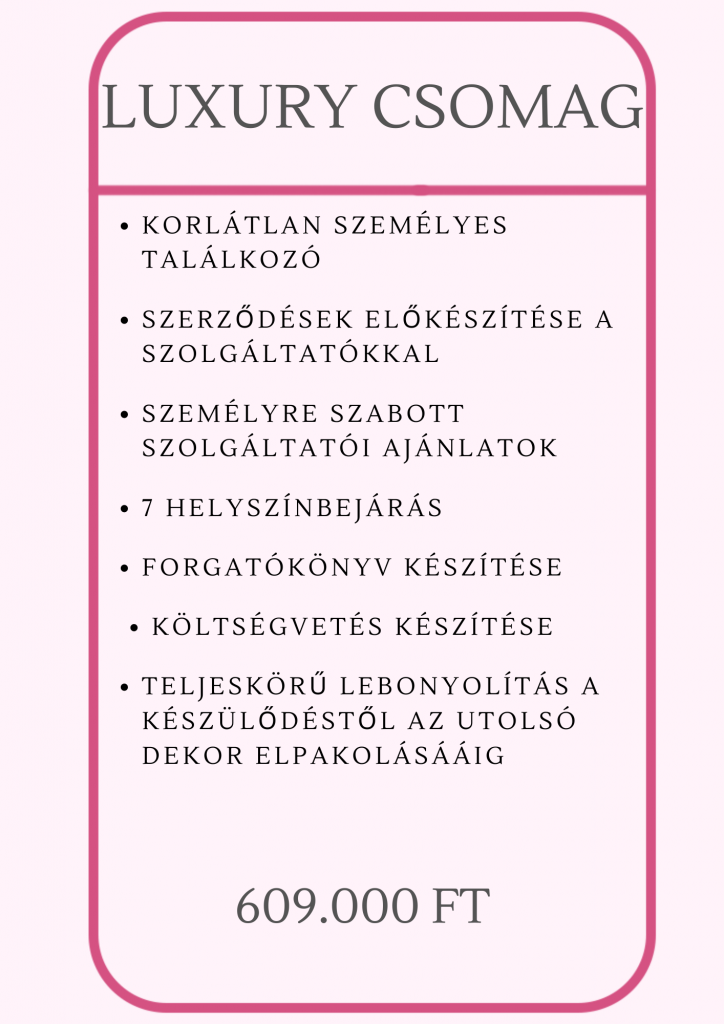 Úgy gondolom, hogy eddigi életetek legszebb napja az esküvőtök lesz. Az odavezető út pedig akkor a legélvezetesebb, ha tudjátok, hogy az álomesküvő, amit elképzeltetek gördülékenyen válik valósággá. Számomra a legfontosabb az, hogy az elképzeléseiteket tűzön-vízen keresztülvigyem, így Nektek csak azzal kell foglalkozni, hogy a legjobban kiélvezzétek a Nagy Napot. Remélem hamarosan találkozunk!